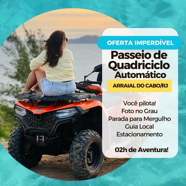 Desfrute de uma emocionante aventura em Arraial do Cabo com nosso passeio de quadriciclo guiado por um profissional experiente. Você terá a oportunidade de dirigir seu próprio quadriciclo, com capacidade para até duas pessoas por máquina. Explore as belas paisagens da região enquanto desfruta de uma experiência inesquecível.