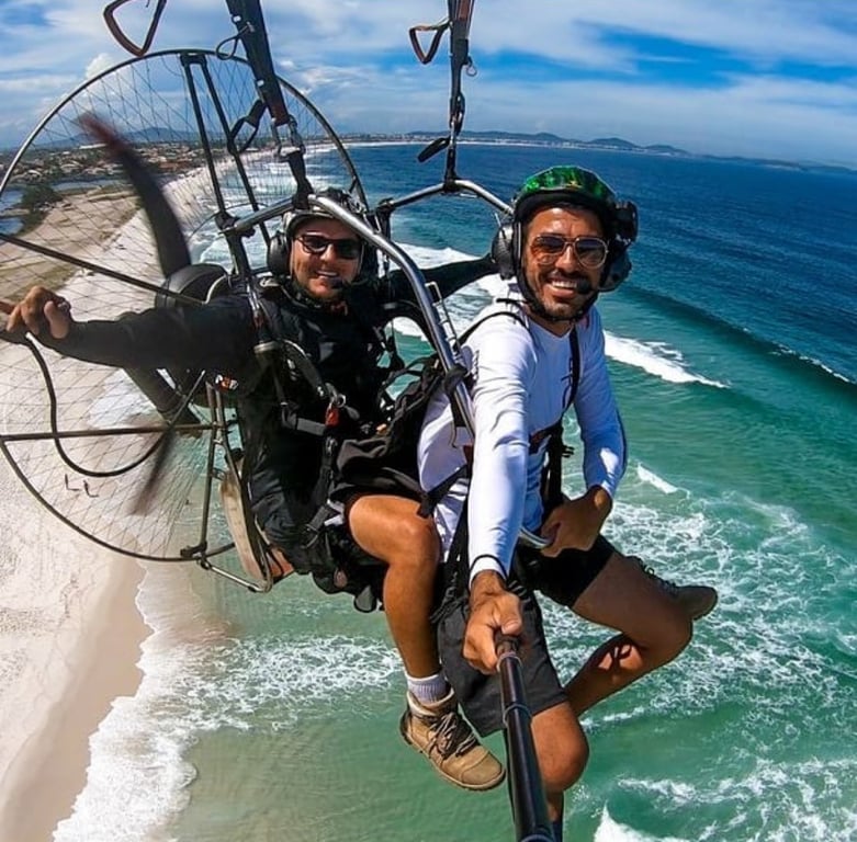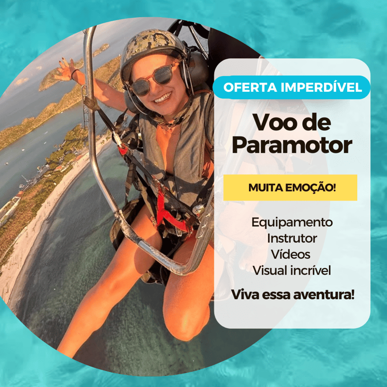 Sobrevoe os cantos mais bonitos da região num vôo duplo de instrução de Paramotor de aproximadamente 15 minutos!Os voos são realizados em Arraial do Cabo, mais precisamente na Praia do Pontal ou na Praia Grande (dependendo da direção do vento).